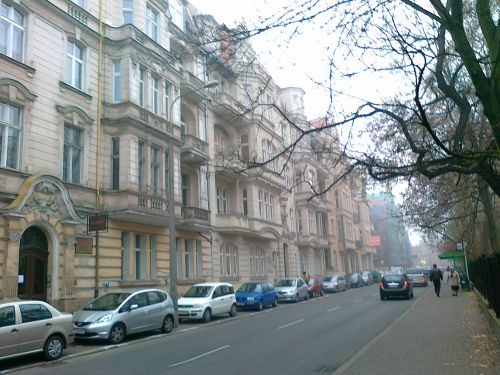 We reach the junction with Słowackiego Street and turn right. This street is lined with town-house residences up to the junction with Kochanowskiego Street, and from that point with a series of town houses. Particular attention needs to be devoted to the town house at No. 20, which was handed over to the University of Poznań after World War I and the town house at No. 22 which currently houses the Poznań Jeżyce Tax Office and the Poznań City Hall, both of the buildings designed by the Lindner & Roskam company. In a further part of the street it is worthwhile paying special attention to the town house at No. 34, which was designed before 1906 by Paul Pitt for Jan Kosicki, a bank director. We reach Prusa Street and turn right into it only to take a turning left after a while into the historic town square, Rynek Jeżycki. A regular market square, built shortly after the Jeżyce borough had been incorporated to the city, was rapidly developed with impressive town houses. The most interesting of these are four houses combined into one composition - erected in 1904 at the southern frontage of the market square for K. Wendland, a wine merchant. In particular, it is worthwhile taking a look at the town house at No. 1 on the corner of Kraszewskiego Street, into which we are going to turn.
