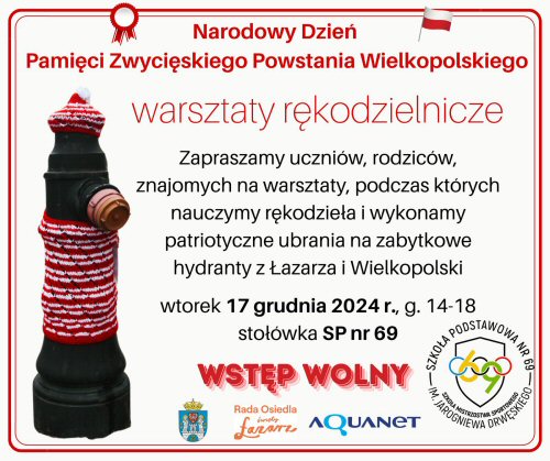 We wtorek, 17 grudnia w Szkole Podstawowej nr 69 odbędą się warsztaty rękodzielnicze, w trakcie których będzie można uszyć patriotyczne ubrania. Zawisną one na zabytkowych hydrantach i mają przypominać o rocznicy zwycięskiego Powstania Wielkopolskiego.