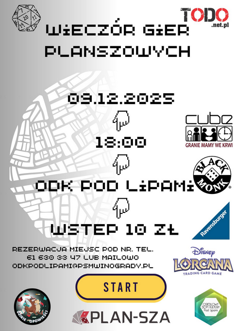 Na górze po lewej stronie znajduje się kość do gry. W tle umieszczono duży, jasnoszary zarys mapy z siatką ulic. Na froncie dłonie pikselowe wskazujące w dół. Po prawej stronie plakatu umieszczono logotypy wydawców gier planszowych. U dołu widnieje żółty przycisk z napisem "Start". Pod nim znajdują się trzy dodatkowe logotypy z ilustracją graczy przy stole, logo Plan-Sza oraz zielono-białe logo ODK "Pod Lipami". Informacja o rezerwacjach zawarta w treści artykułu. Pobierz baner (PNG, 266,00 kB)