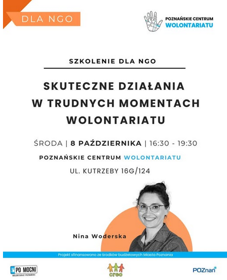 Osoby koordynujące wolontariat i przedstawiciele stowarzyszeń, fundacji, grup nieformalnych, instytucji pożytku publicznego działających w Poznaniu zaproszeni są na szkolenie pod tytułem "Skuteczne działania w trudnych momentach wolontariatu".