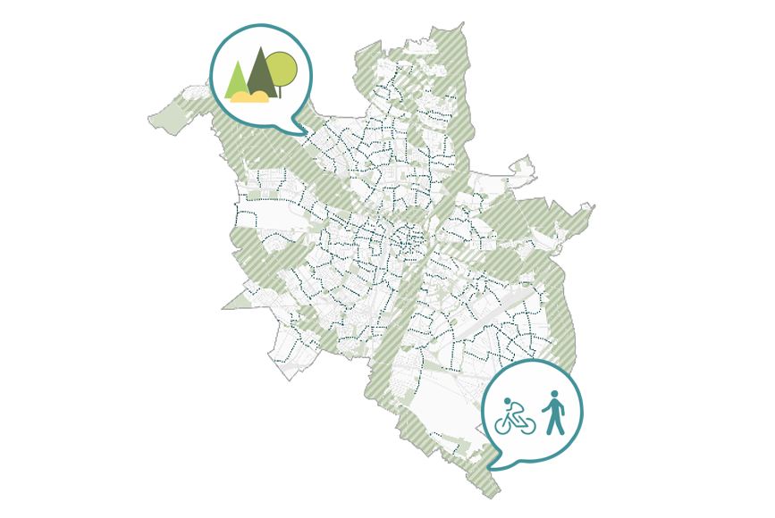 Szczególną rolę w adaptacji miasta do zmian klimatu odgrywa klinowo-pierścieniowy system zieleni, który tworzy naturalną sieć przewietrzającą i regenerującą powietrze. Już ponad 77 proc. powierzchni tego systemu jest objęta miejscowymi planami, które gwarantują jego zachowanie i spójność. System ten uzupełniają nowo projektowane łączniki zieleni. Są to piesze i rowerowe trasy obsadzone drzewami i krzewami, łączące kliny zieleni z większymi terenami wolnymi od zabudowy. To rozwiązanie, wprowadzone w "Studium uwarunkowań i kierunków zagospodarowania przestrzennego Miasta Poznania" z 2023 roku, zwiększa dostępność zieleni dla mieszkańców.