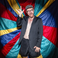 Postać w tradycyjnym stroju ludowym nosi maskę o wyrazistych, malowanych rysach twarzy z dużymi oczami i szerokim uśmiechem ukazującym zęby. Maska jest otoczona długimi, jasnymi włosami z wełny. Na głowie ma ozdobny kapelusz z frędzlami, pomponami i kolorowymi dodatkami. Strój z kwiecistej koszuli, haftowanych elementów i frędzli w czerwonym, zielonym oraz białym kolorze. W rozmytym tle uczestnicy wydarzenia.
