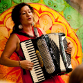 Postać w tradycyjnym stroju ludowym nosi maskę o wyrazistych, malowanych rysach twarzy z dużymi oczami i szerokim uśmiechem ukazującym zęby. Maska jest otoczona długimi, jasnymi włosami z wełny. Na głowie ma ozdobny kapelusz z frędzlami, pomponami i kolorowymi dodatkami. Strój z kwiecistej koszuli, haftowanych elementów i frędzli w czerwonym, zielonym oraz białym kolorze. W rozmytym tle uczestnicy wydarzenia.