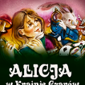Dziewczynka ubrana w zimowy płaszcz i czapkę stoi przed świetlną instalacją, która przedstawia przedmioty z bajki Alicja w Krainie Czarów. Wokół dużego zeraga rosną kolorowe grzyby, wiszą karty i siedzi Biały Królik.